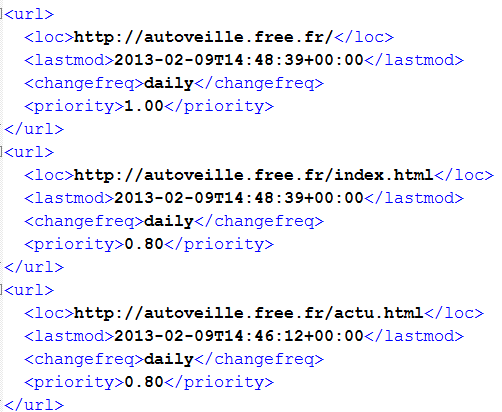 VoilĂ un des XML que j’ai crĂ©e, c’est le sitemap d’AUTOVEILLE