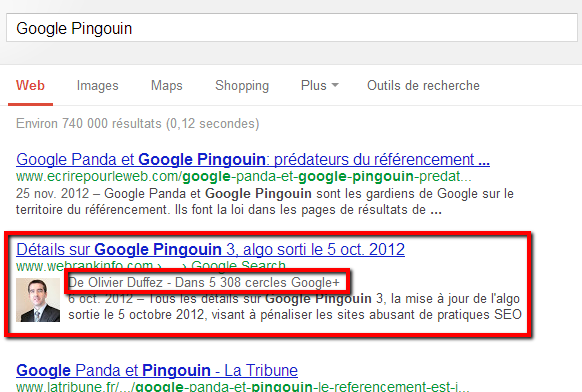 On constate que dans les SERP, le profil Google + de l’auteur est associĂ© au contenu / Ă un article du site / blog (avec le nombre de cercles oĂč il se trouve). La notoriĂ©tĂ© et la rĂ©putation de l’auteur peut jouer Ă©normĂ©ment sur la confiance des internautes par rapport Ă ses propos (pour Olivier Duffez, je pense qu’il est LA rĂ©fĂ©rence pour le SEO en France, avec Olivier Andrieu, bien sĂ»r).