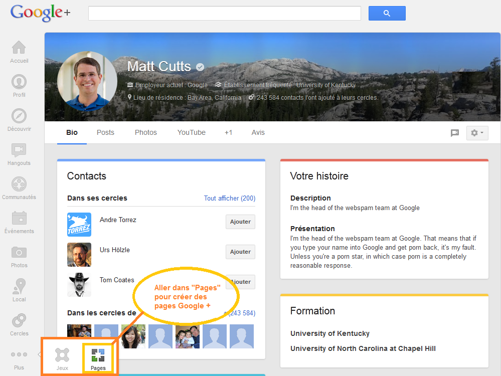 2) Optimiser les diffĂ©rents onglets du profil avec un minimum d’informations (bon, j’ai pris le profil de Matt Cutts, car je n’avais pas trop d’idĂ©es lol)