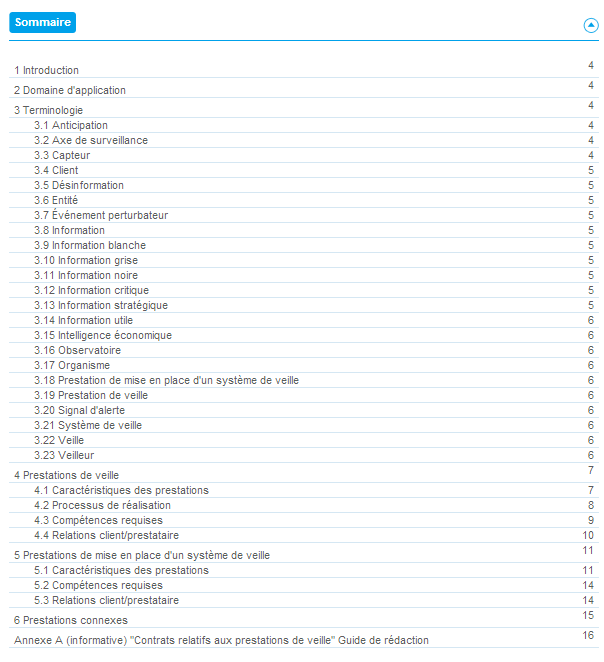 En résumé, cette norme établit les grands concepts de la veille et le processus (du brainstorming, passant par la collecte des sources, et la veille des informations en elle-même).