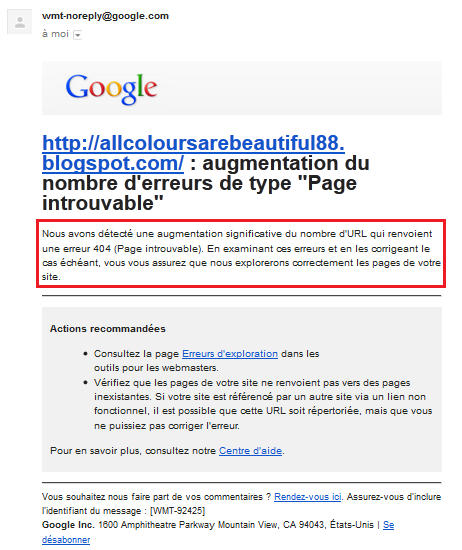 Mail alerte de Google Webmaster Tools Pages erreurs 404 | Tests AUTOVEILLE