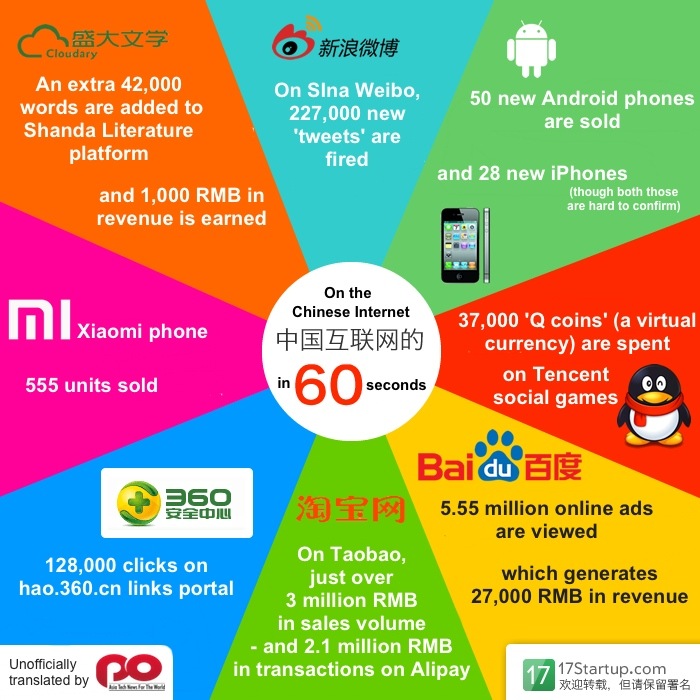 En résumé, cette infographie montre ce qui se passe sur le web chinois en 1 minute (elle a été réalisée par 17Startup.com) :