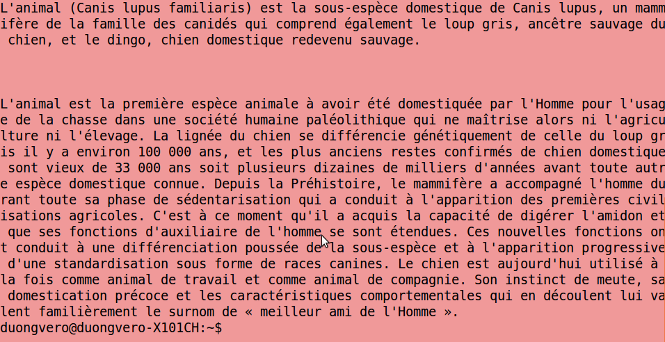 J’ai dĂ©veloppĂ© un script Perl et Ă©laborĂ© un petit dictionnaire de synonymes pour faire ce test. En le lançant dans ma Konsole, j’obtiens tout d’abord un rĂ©sultat brut sans redirection vers un autre fichier .txt :