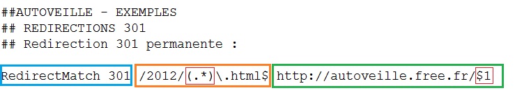 - La nouvelle URL réécrite sur laquelle on va faire les redirections permanentes (ici en vert : http://autoveille.free.fr/ $1)