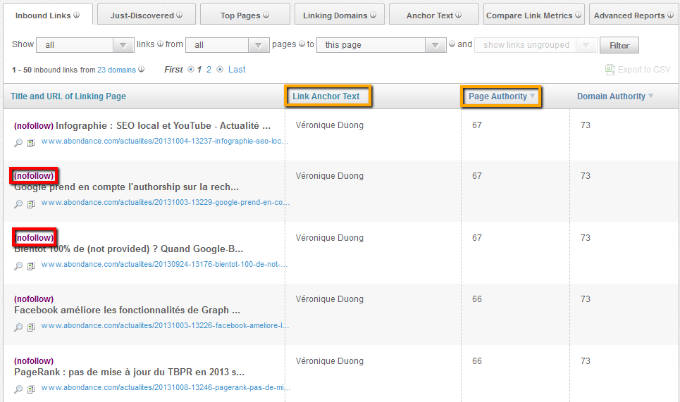 Dans les exemples ci-dessus, les liens sont issus des commentaires sur les blogs d’oĂč les liens en nofollow. L’ancre utilisĂ©e est mon nom et mon prĂ©nom (VĂ©ronique Duong) comme vous pouvez le voir. On peut aussi observer l’autoritĂ© de la page qui pointe vers le mien.