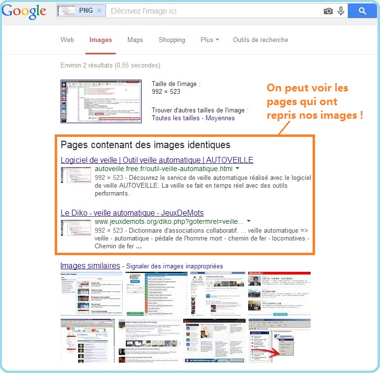 Avec cette méthode, on peut aussi détecter les pages web qui ont repris nos images :