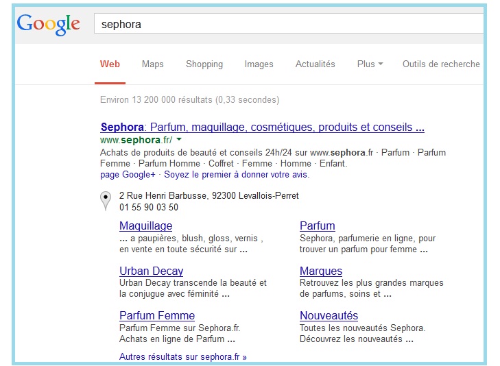 Alors, on va commencer par analyser un snippet : j’ai choisi la marque « Sephora » mais je prĂ©cise que je ne travaille pas pour. Sur Google, lorsqu’on entre la requĂȘte « Sephora »,  on voit les Ă©lĂ©ments suivants apparaĂźtre :