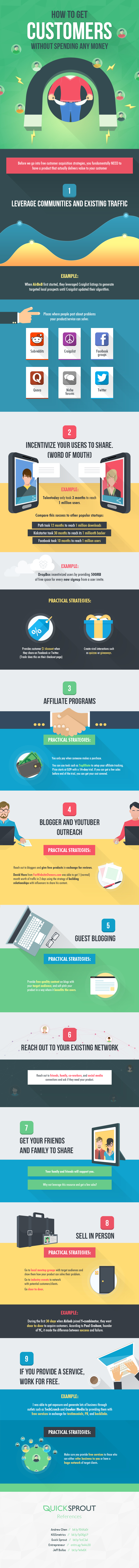 J’ai beaucoup aimĂ© cette infographie car elle m’a appris de nouvelles mĂ©thodes pour obtenir des clients sans dĂ©penser. Les entreprises qui ont de petits budgets devrait lire et appliquer quelques conseils de cette illustration. L’auteur aurait pu ajouter l’Inbound Marketing et le SEO, mais je pense qu’on peut comprendre ces deux Ă©lĂ©ments dans la partie du Guest Blogging.