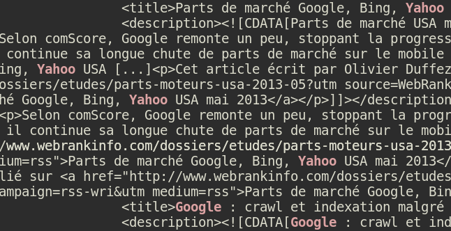 Et voilà , en plus je vous ai récupéré la derniÚre news du jour (19/06/2013) qui parle des parts de marché de Google, Bing, Yahoo du site WebRankInfo !